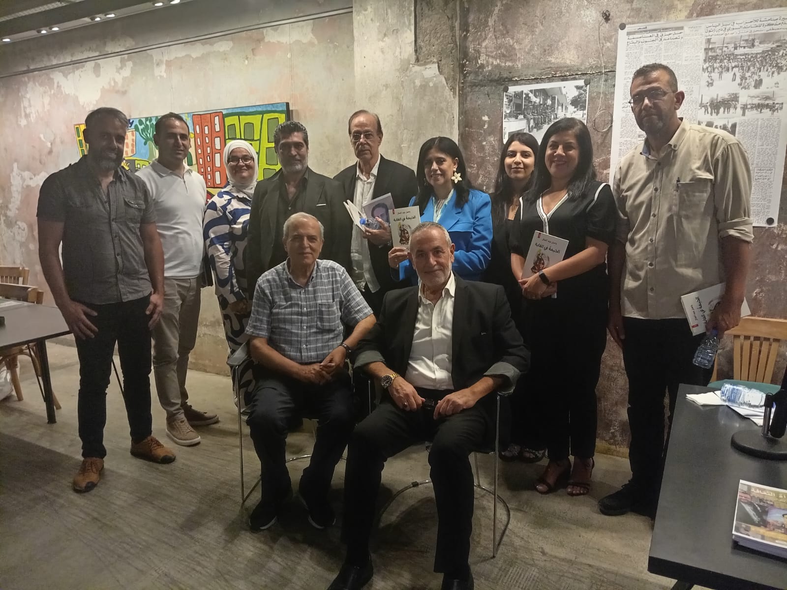 المشاركون في الندوة في صورة تذكارية مع ديوان الشاعر عبد العال