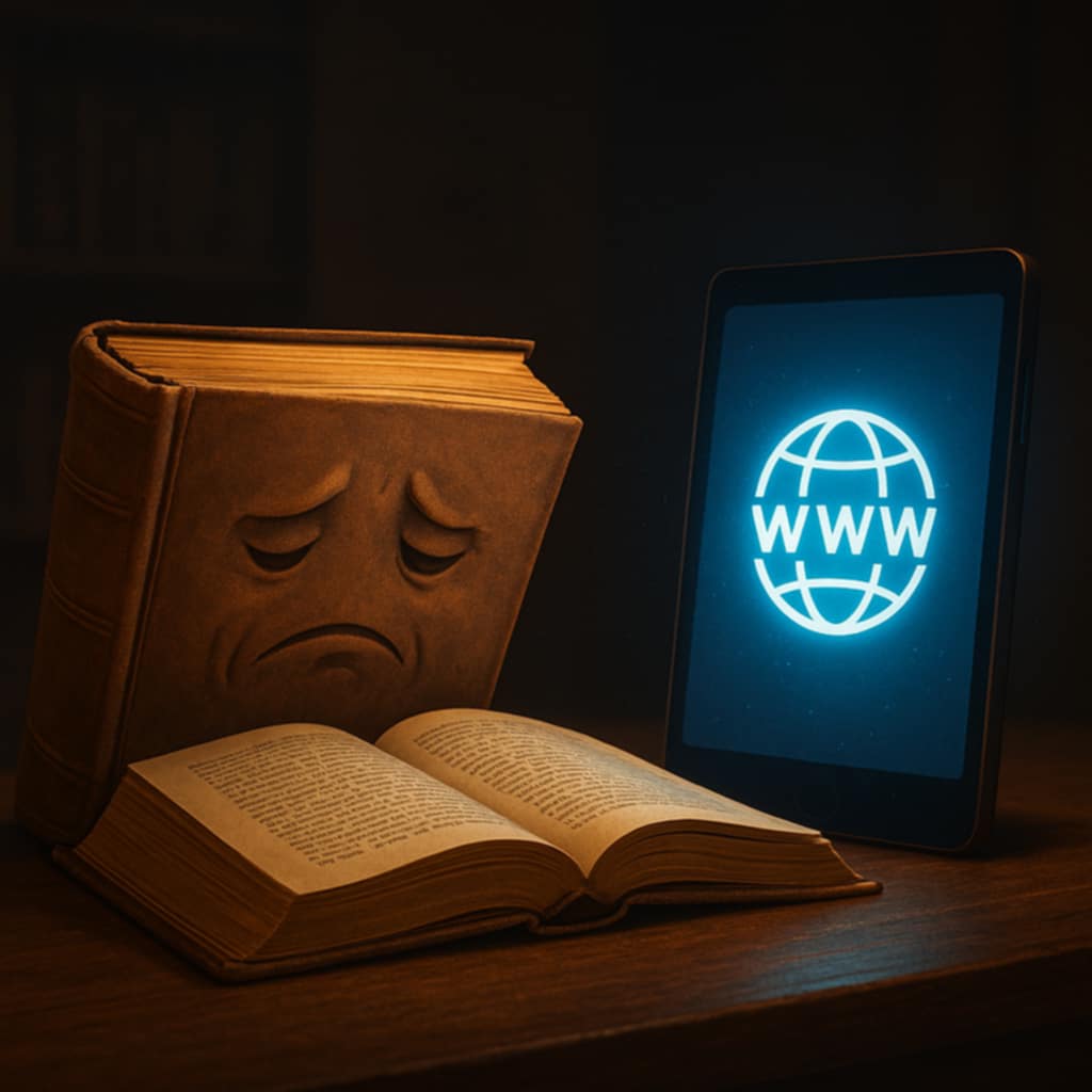 “يا من تحفظ الغبار بين أوراقك، أما علمتَ أن الدنيا قد تسارعت؟ أنا السرعة والحداثة، أنت البطء والرتابة. أنا المدخل إلى كل العوالم، وأنت سطر بعد سطر، ومملّ لمن استعجل الزمن.”