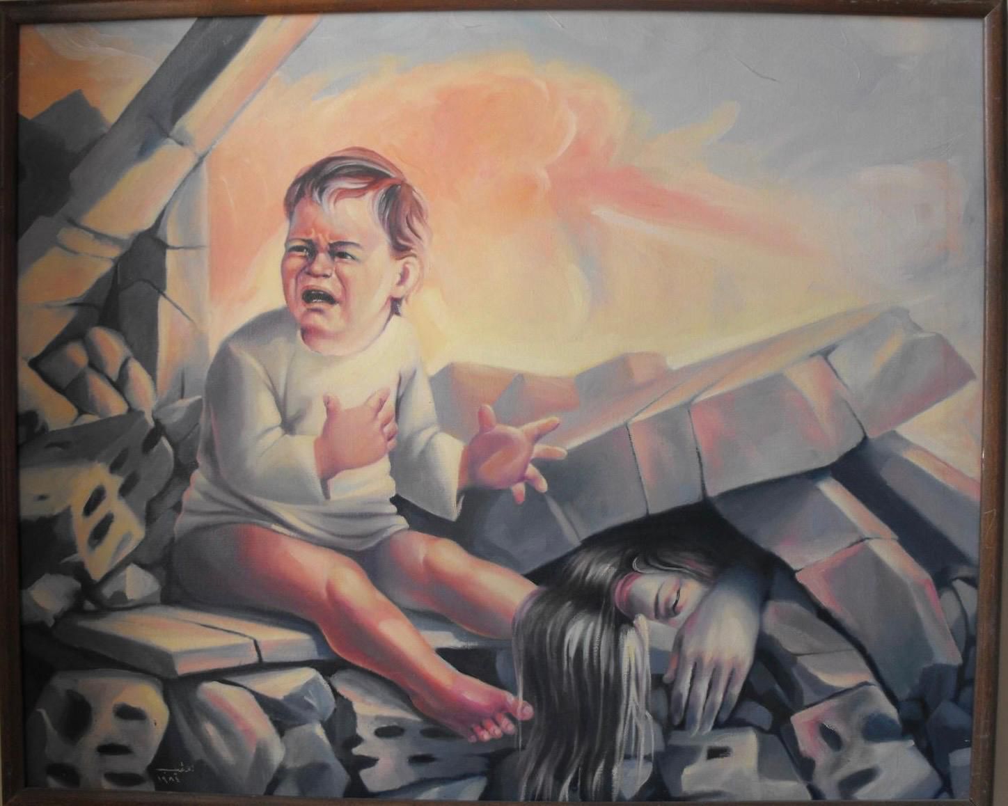 لوحة “الطفولة و الحرب” للفنان محمد علي الخطيب. زيتية. 1984.