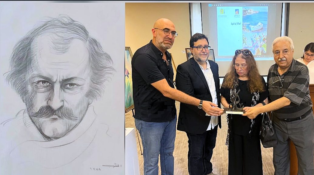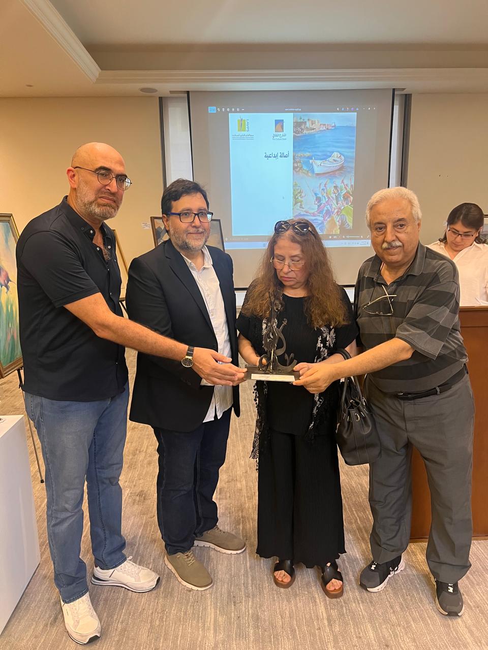 الأديبة ذُكاء الحُرّْ تتسلم درع تكريم زوجها الراحل الفنان محمد علي الخطيب.
