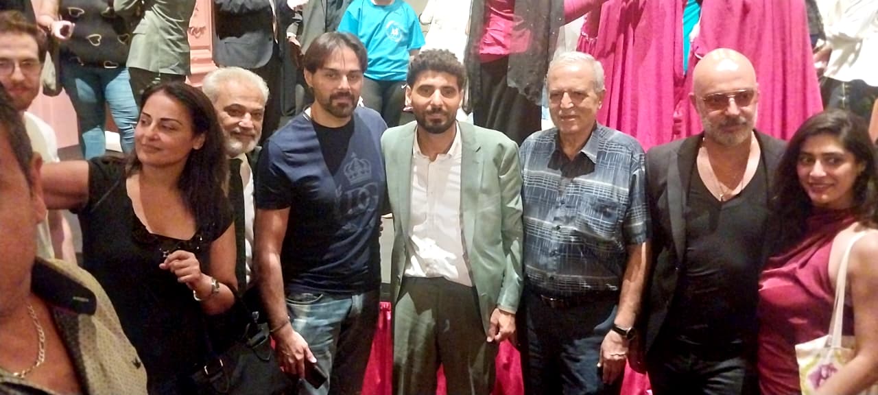المخرج قاسم اسطنبولي بين صاحب موقع ميزان الزمان المخرج يوسف رقة والممثل النجم مازن معضّم وبعض الأصدقاء خلال حفل افتتاح قاعة المسرح الوطني في كوليزية الحمراء