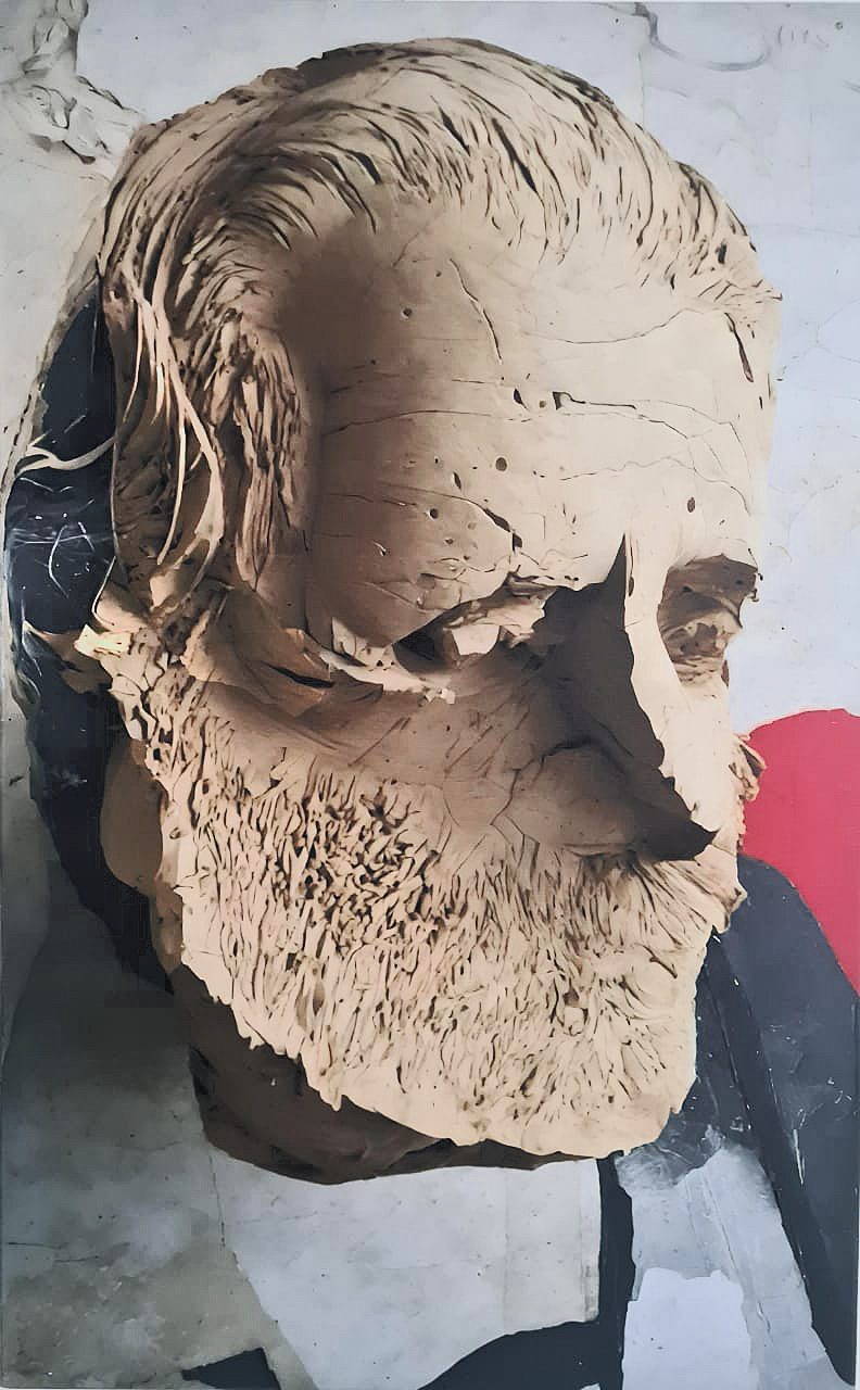 في لوحة الفنان والموسيقي مرسيل خليفة، لا يكتفي الفنان د. علي بتصوير الوجه كمغنٍ، بل يصنع منه رمزًا ثقافيًا وإنسانيًا متأملًا. الوجه، المشكّل بخامة سميكة، يحتل مركز اللوحة بخطوط متوترة وملامح غائرة. الدرجات الترابية والبيج تمثل الهدوء والحكمة، بينما يرمز الأحمر في الخلفية إلى العاطفة الثورية التي تميّز مرسيل، وإلى النبض المقاوم الذي يسكن موسيقاه. وجهٌ منكس الرأس كأنّه ينصت إلى موسيقاه الداخلية، في تأملٍ وصمتٍ عميقين، فتتحول ملامح الحزن إلى تجسيد للكرامة والتفكير الوجودي. ما يضيف بُعدًا فلسفيًا للوحة هو الطريقة التي يجعل بها الفنان الوجه يبدو وكأنّه “خُلق من الطين”، كما في النصوص التراثية.