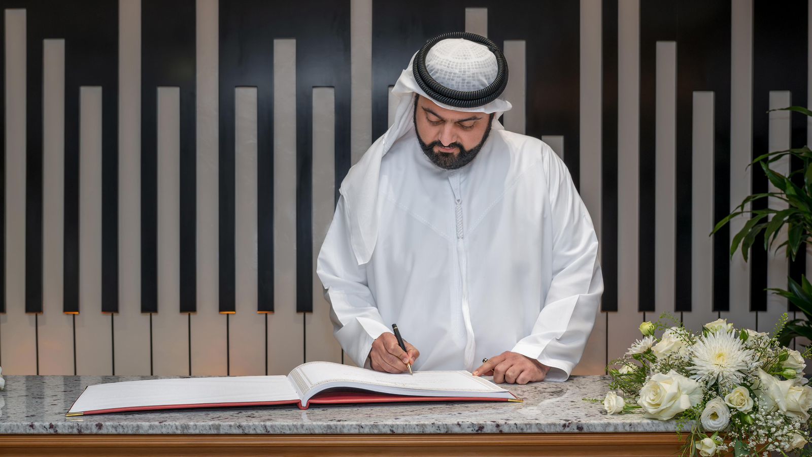سمو الشيخ محمد بن حمد الشرقي ولي عهد الفجيرة يكتب كلمة في السجل الذهبي
