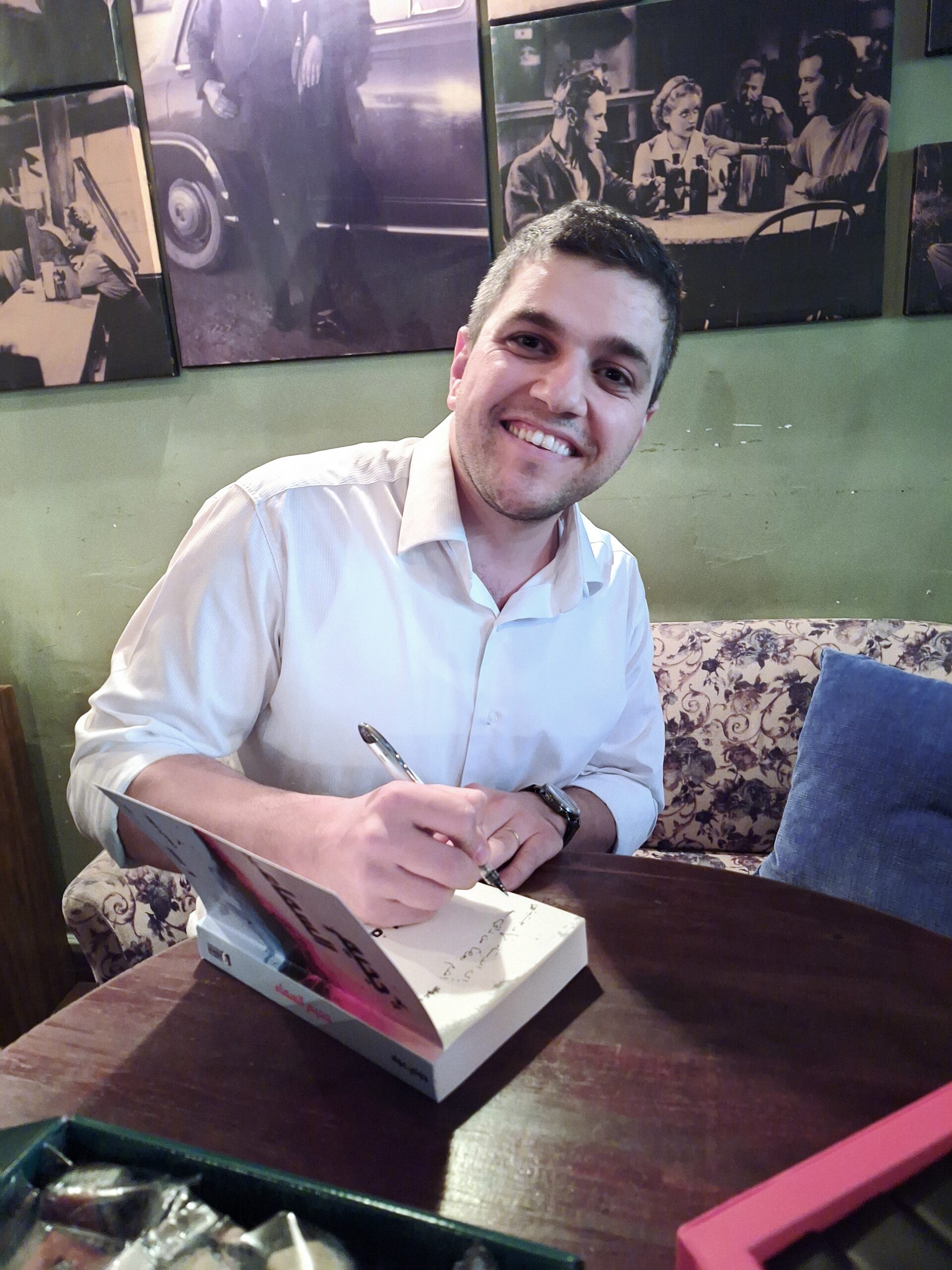 جوني عواد خلال توقيع روايته ” جحيم السماء ” في مقهى الحمراء