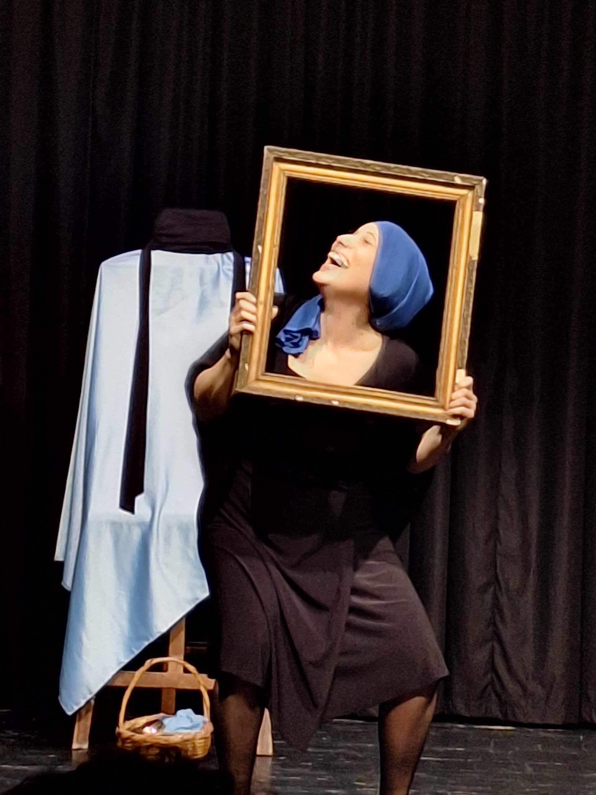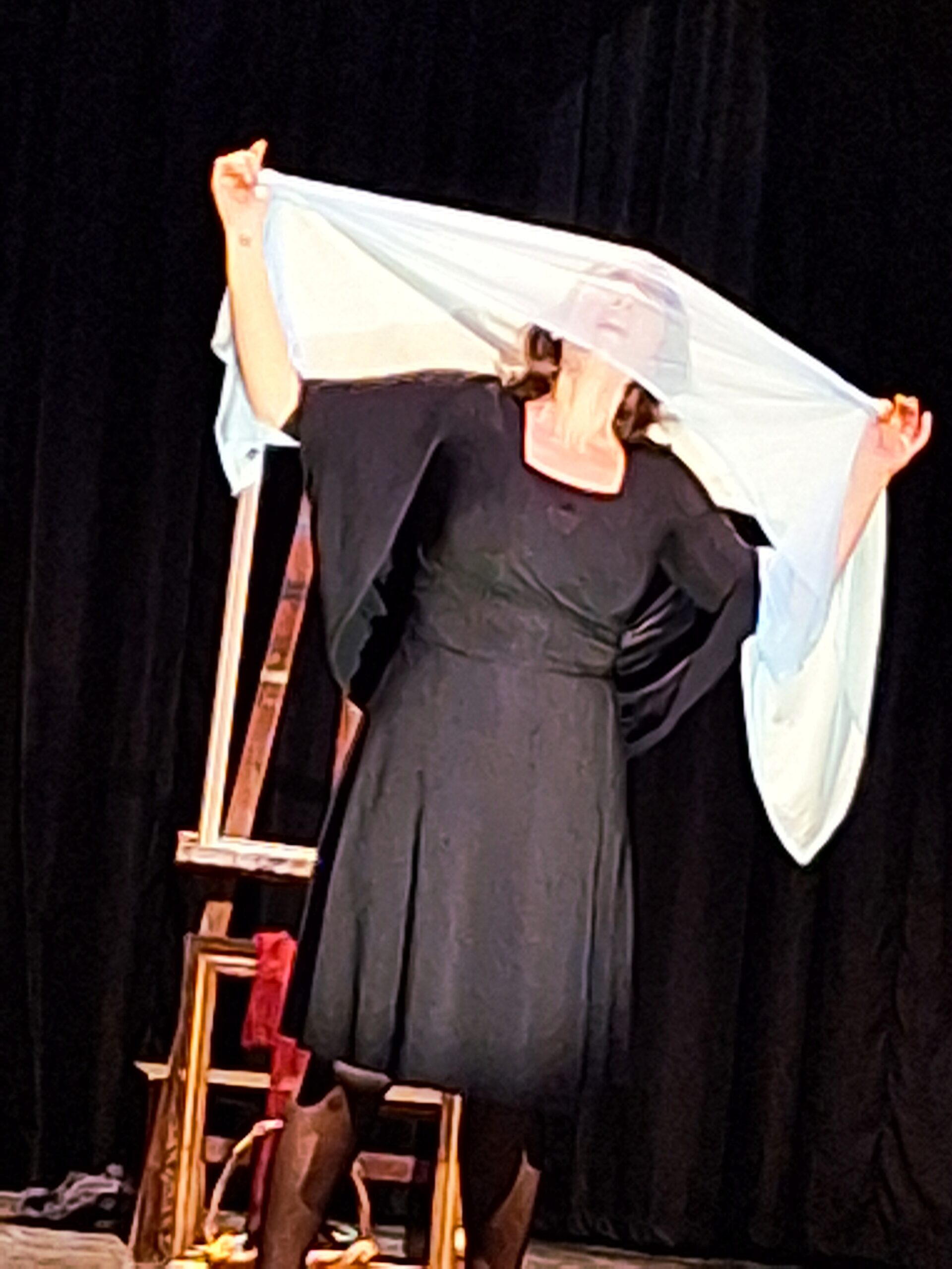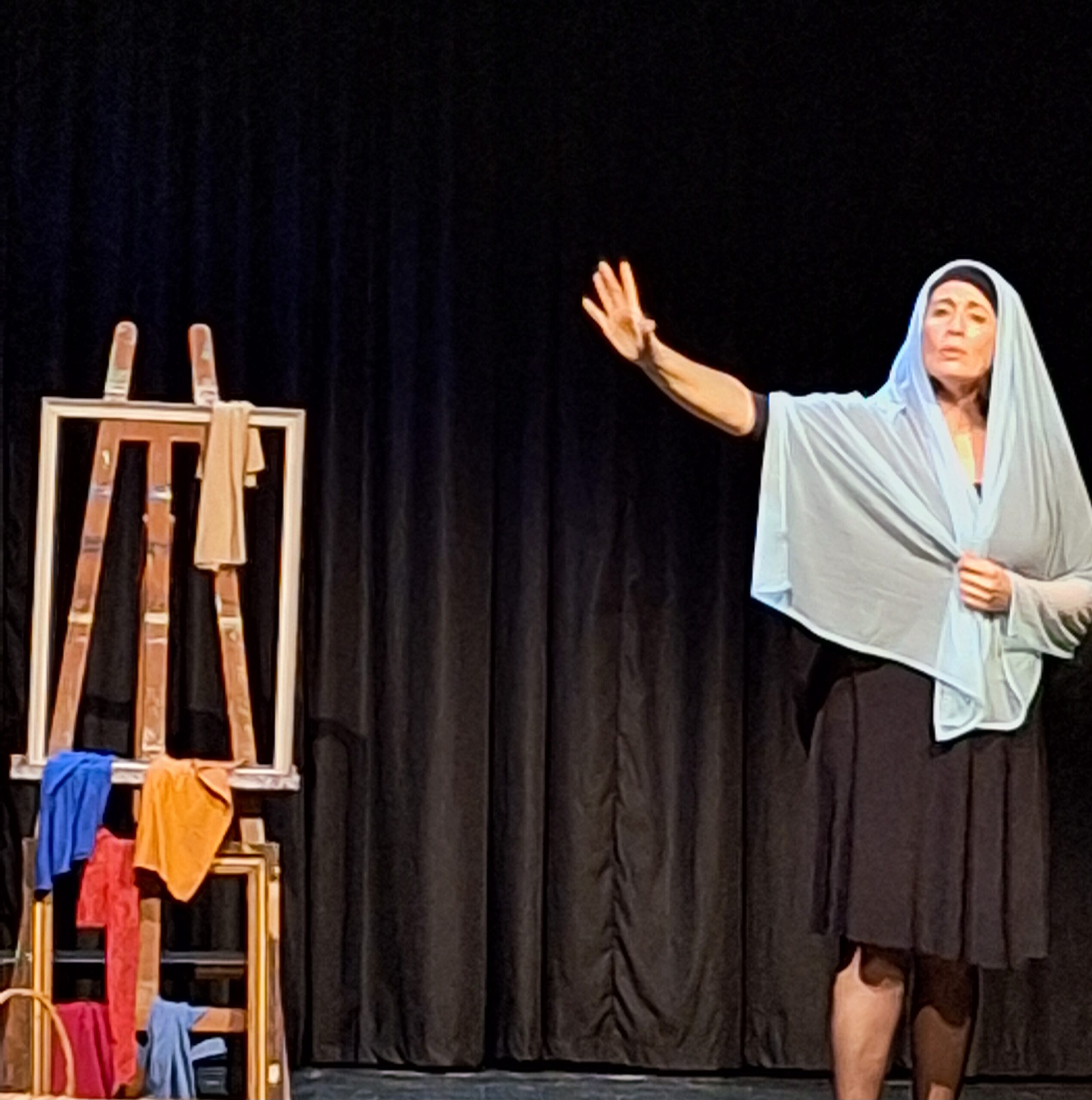 الخشبة خالية ألا من كرسي خشبي صغير و trepied peinture مغطى بقماش وفوقه قبعة تتغيّر بين مشهد وآخر للتعبير عن الشخصية التي تلعبها الممثلة مع إطار فارغ تملأه الممثلة في بعض المشاهد .