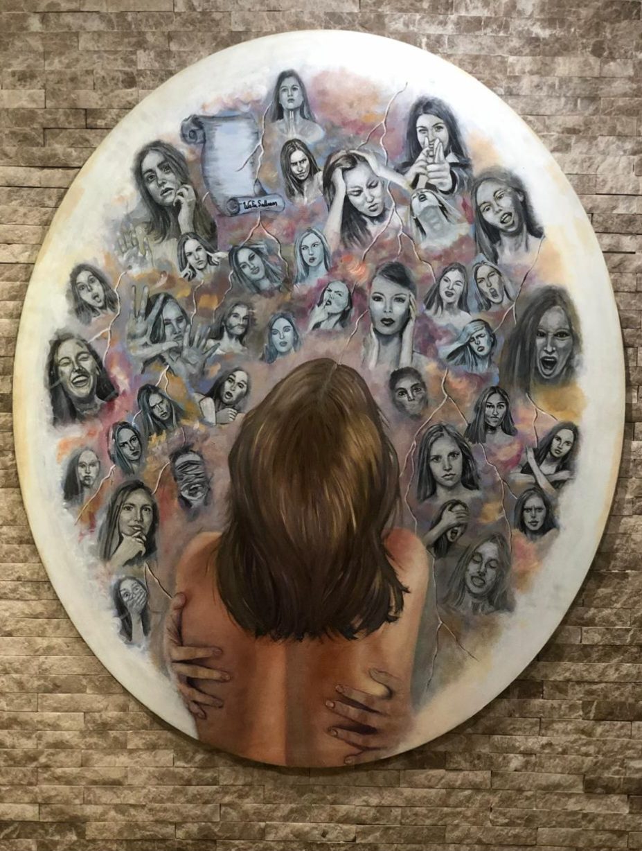 اللوحةُ تحوي نحو أربعين وجهًا لامرأةٍ واحدة، تتوزّع ضمن دائرةٍ تحاكي مرآةً داخلية، تعكس الملامح نعم، لكنها تكشف العُمقَ أيضًا، وتدعو المشاهد للانغماس في رحلةِ الاكتشاف النفسي، لا الاكتفاء بالنظر من الخارج.